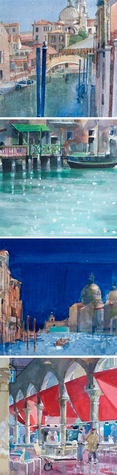 TO BE FOLLOWED BY: Geoffrey of Venice Geoffrey is old-school. He wears a hat, drinks local red wine at the worker's bar, and paints and draws every day. Regimen and discipline, startling words in the vocabulary of a society that demands instant results with little effort. He's a painter's painter, working out of a personal inclination and a love for the natural marvels--line, form, light, color. His brush and pencil are his best friends--they direct his daily excursions: the variation of luminosity on a model's shoulder, Venetian homes dancing on their own reflections, the sudden change of a sitter's expression. Honesty, the artist's greatest ambition and also the greatest challenge, is Geoffrey's constant guide. He paints as he sees, his exquisite craftsmanship the perfect vehicle for this homage to nature. As young man he came upon Venice where he learned observation from those who know it best--boat people who live by the sun's movements. The venerated vedutisti, Guardi and Canaletto, these he paid attention to also while developing an individual palette and style that bears his pictorial signet. Venice is a visceral place. Those frenzied Vivaldi rhythms are simply the translation of thunder, blowing leaves, wind, waves, birds. The dreaded scirocco flowing through the musician's ears. At high sun, the intoxicated facades can be bright and cheerful. When it rains, the reds and yellows become pallid and remorseful. Saturated colors, reflections--these elusive visions constantly adjusting to the changes of weather and time are then translated by the painter's eyes. One must love a place to describe it with such profound and constant devotions. Geoffrey is such a lover, abandoning himself to complete immersion in the wanton ways of Venice. Then there is the body of a woman... |
